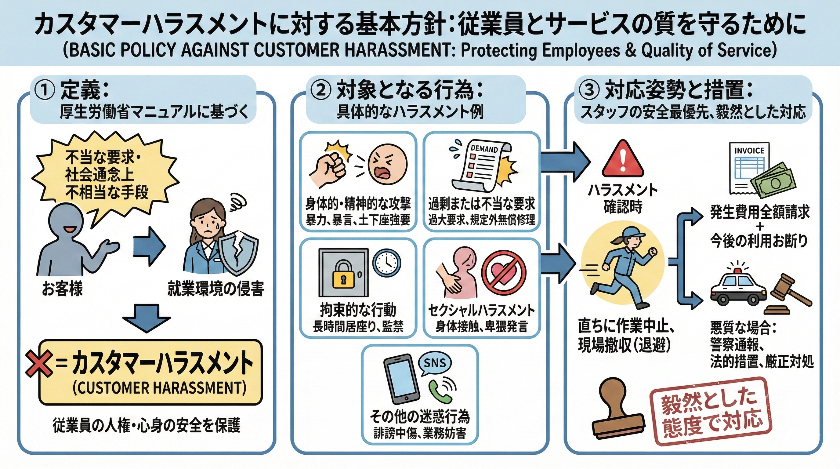 上記のハラスメント行為が確認された場合、スタッフの安全を最優先とし、作業の途中であっても直ちにサービス提供を中止し、現場から撤収(退避)いたします。