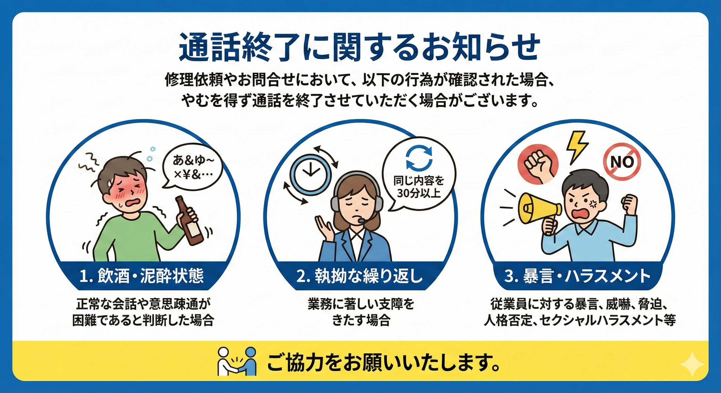- 修理依頼やお問合せにおいて、以下のような行為が確認された場合、やむを得ず通話を終了(切断)/着信拒否させていただく場合がございます。