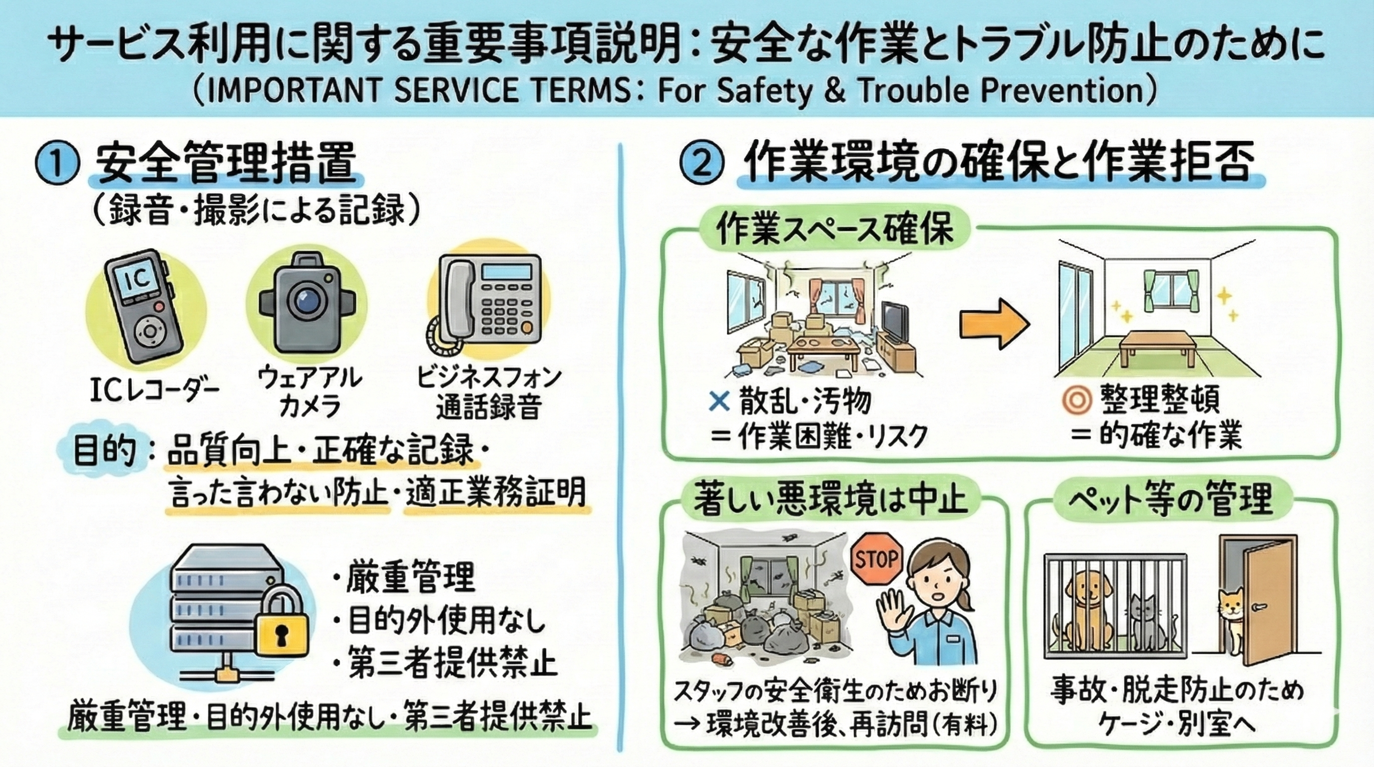 当社では、サービス品質の向上、ご契約内容や説明事項の正確な記録、および防犯・安全管理の観点から、お電話での通話内容や、ご訪問時の作業状況(会話および施工箇所)をICレコーダーやウェアラブルカメラ等を用いて記録(録音・録画)させていただく場合がございます。「言った・言わない」のトラブルを防ぎ、適正な業務遂行を証明するための措置ですので、何卒ご了承ください。