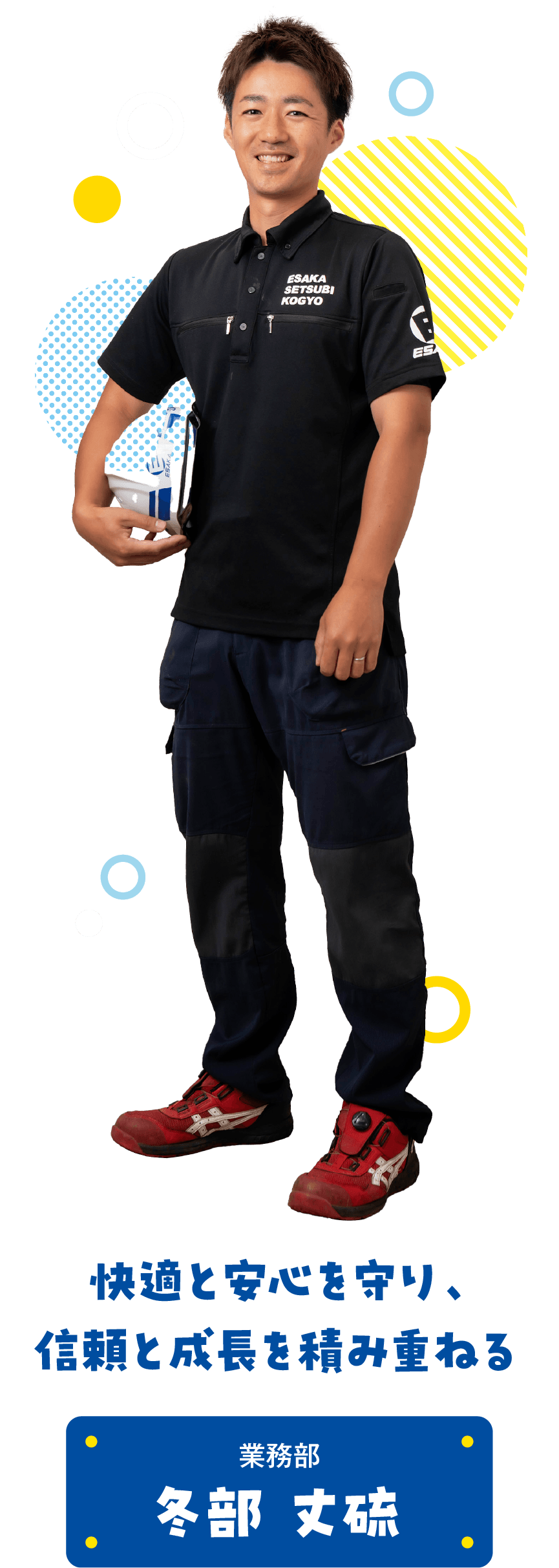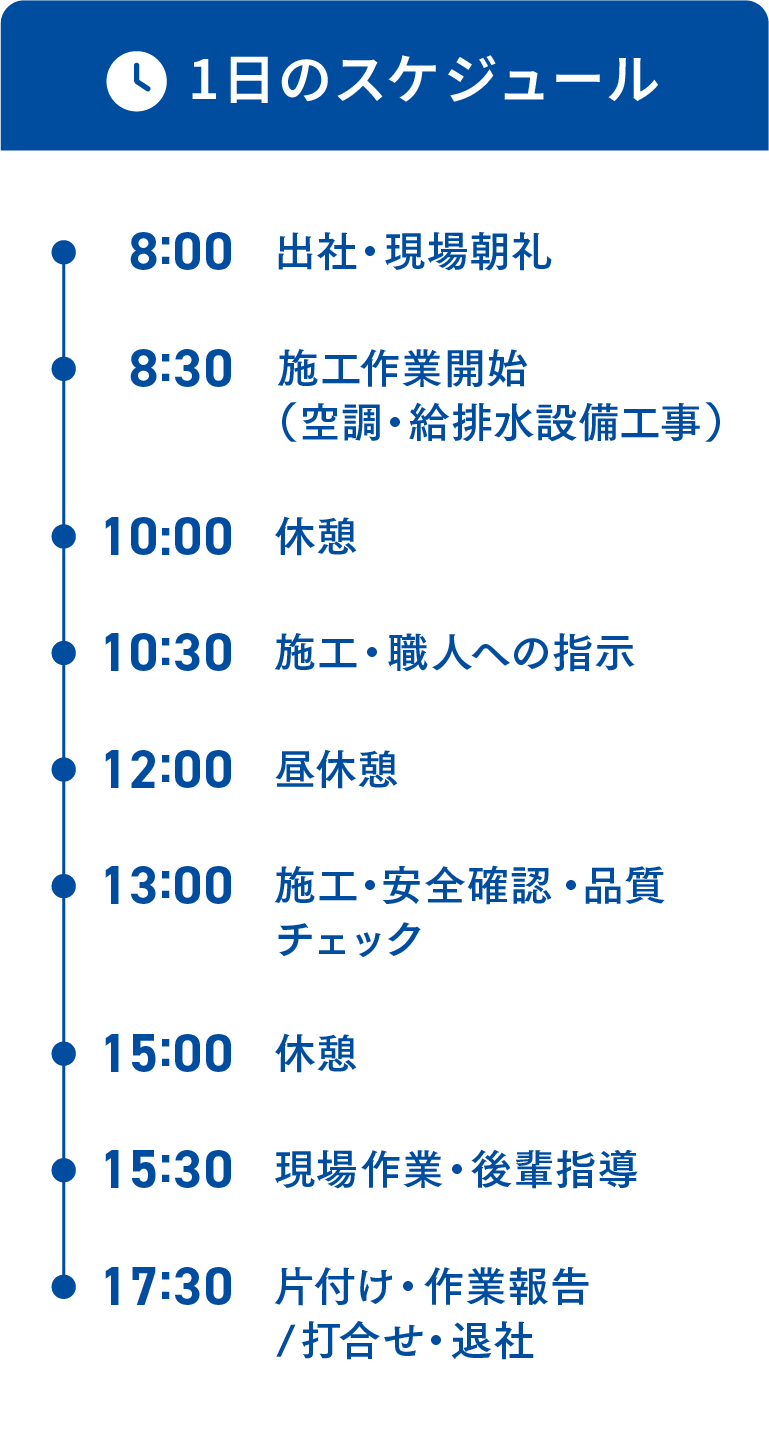現場の職人として、空調・給排水設備の施工を担当しています。産業技術専門校の住宅設備課で学んだ知識や資格を活かし、大型マンションなどの現場も経験。現在は入社5年目となり、大型マンション現場で職長を任されるなど、少しずつ教える立場としても成長しています。