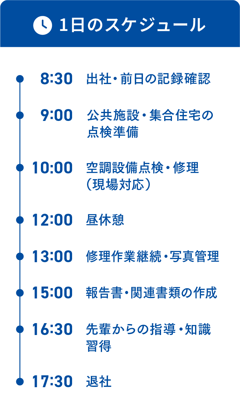 空調設備の点検や修理を通じて、直接お客様の安心や快適な環境づくりに貢献できることが大きなやりがいです。また、写真管理や書類作成などの業務も任されるようになり、自分の成長を実感しています。日々の積み重ねがお客様からの信頼につながることに魅力を感じています。