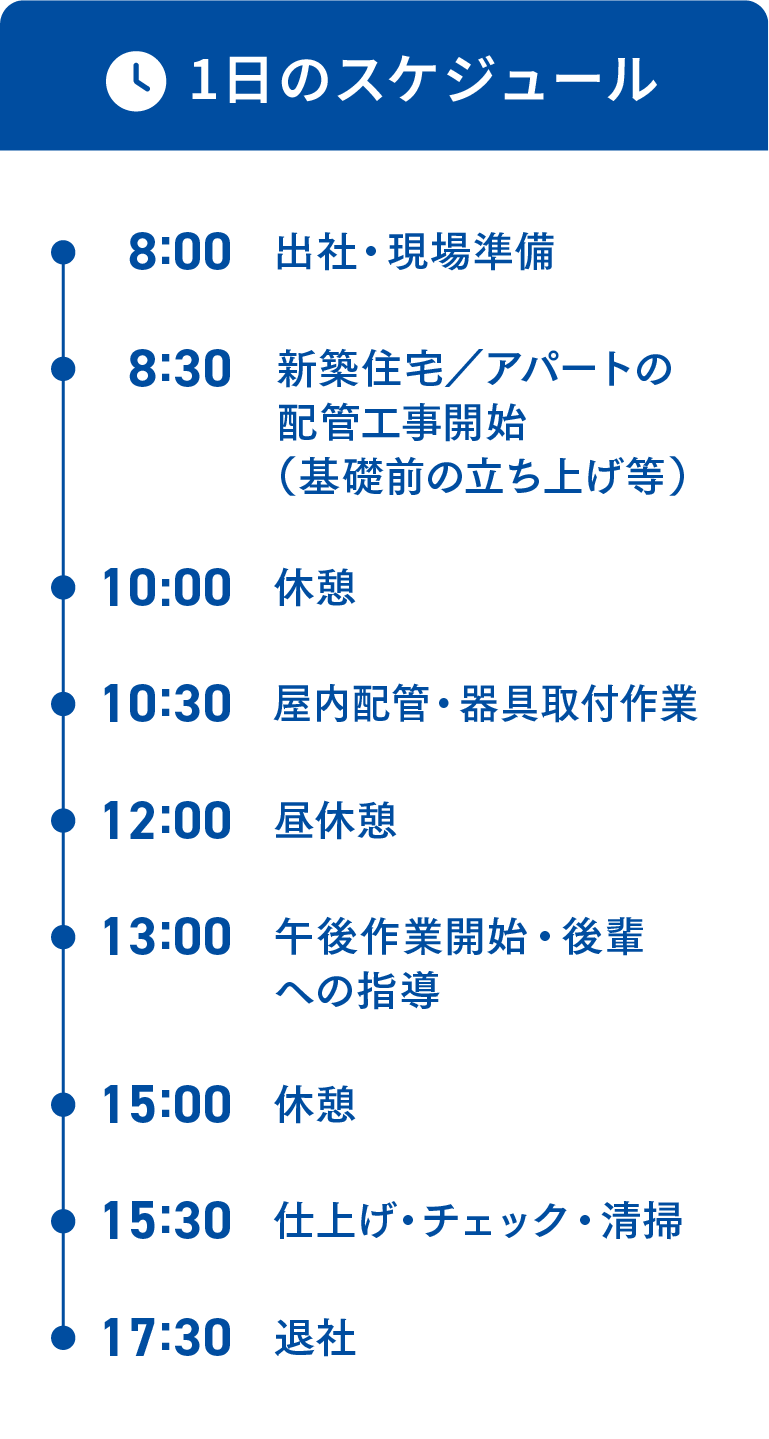 新築住宅やアパートの水まわり工事を担当しています。基礎工事前の配管立ち上げから、屋内の器具付けまで幅広く携わります。経験10年以上となり、現在はチームのリーダーとして後輩の指導にも力を入れています。
