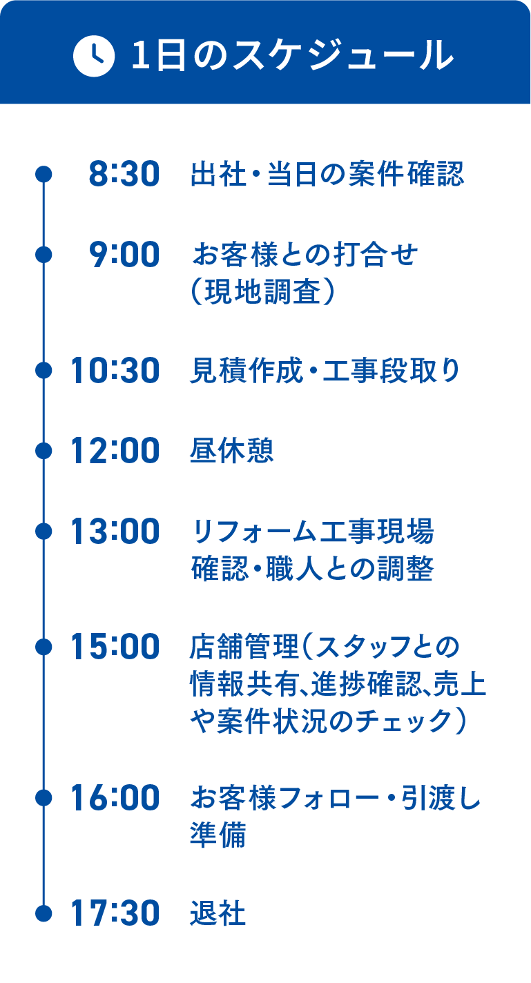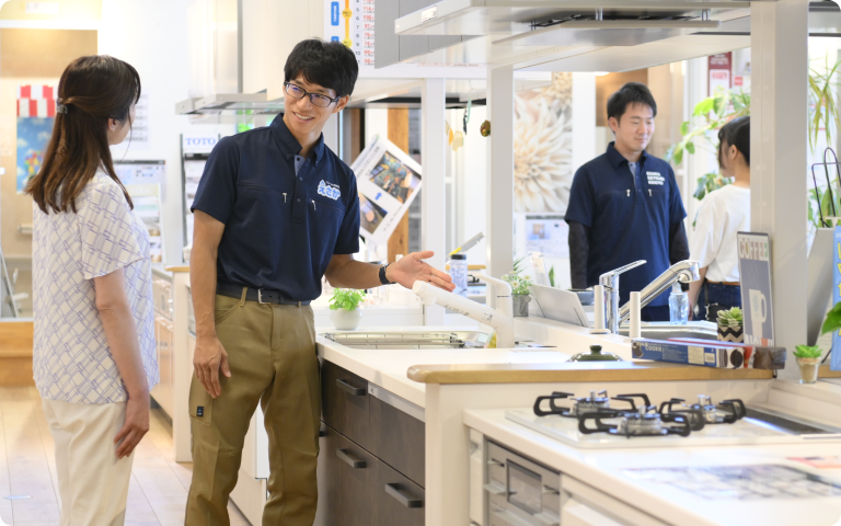 水回りリフォームを中心に、お客様との打合せから設計、工事の手配や現場管理まで一貫して行っています。提案力や調整力、事務処理力など幅広いスキルが求められる仕事です。また、店長として店舗運営や人材育成も担っています。